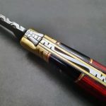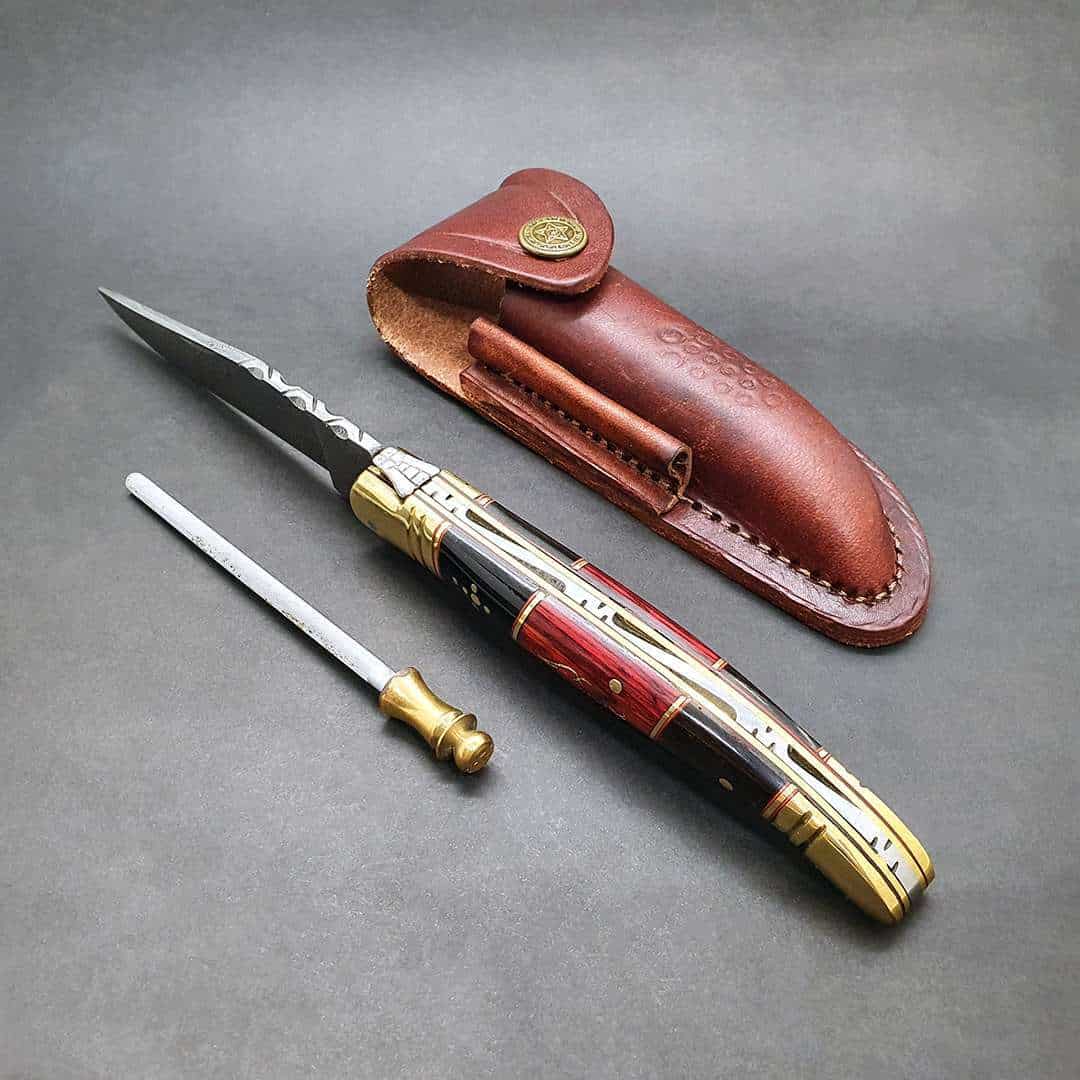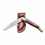 This beautiful Laguiole pocket knife features a Damascus steel blade, brass bolsters, buffalo horn and coloured wood handle, leather pouch and sharpening rod.