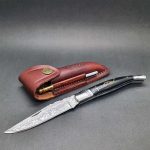 Beautiful Laguiole pocket knife featuring a Damascus steel blade, brass bolsters, buffalo horn handle and leather pouch.