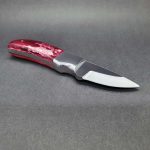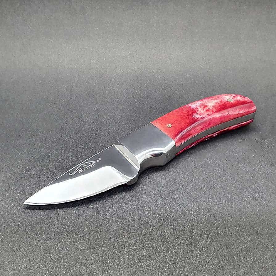 The Pink Lady features a 440C stainless steel blade that measures 5cm (2″) in length, with a belly width of 2.5cm (1″). The blade is supported by a sturdy stainless steel bolster, ensuring a secure grip. The handle is crafted from pink-dyed bone, adding a touch of sophistication to this beautiful knife. The Pink Lady also comes with a leather pouch for easy and safe storage.