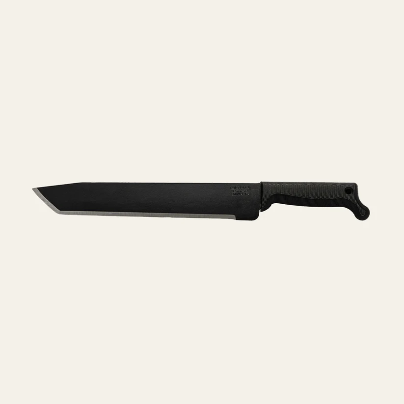 Engineered for durability and precision, this Okapi tanto-shaped machete features a robust carbon steel blade with a sleek, powder-coated finish for enhanced corrosion resistance. The angular tanto tip delivers powerful piercing ability, making it ideal for tough cutting tasks and rugged outdoor use. Combining tactical styling with practical performance, it’s a reliable tool built to handle whatever you throw at it.