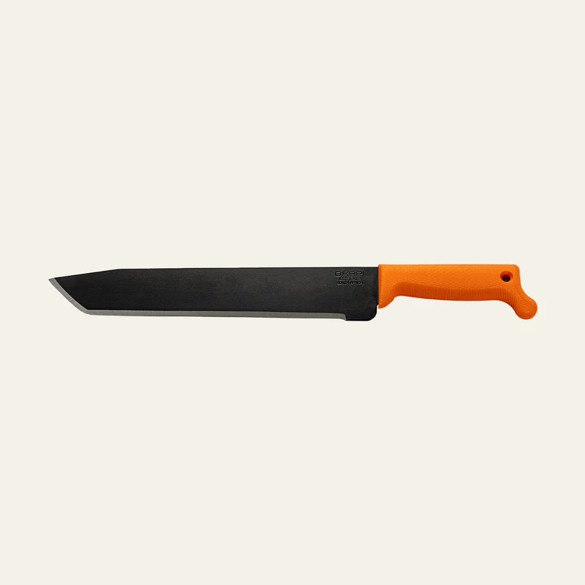 Engineered for durability and precision, this Okapi tanto-shaped machete features a robust carbon steel blade with a sleek, powder-coated finish for enhanced corrosion resistance. The angular tanto tip delivers powerful piercing ability, making it ideal for tough cutting tasks and rugged outdoor use. Combining tactical styling with practical performance, it’s a reliable tool built to handle whatever you throw at it.