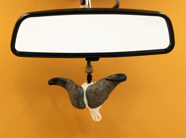 Our Mirror-hanging accessory* attaches into the back of your Skullie and allows you to hang it from your rear-view mirror. The accessory is universal, which means it can attach to any of your Skullies.
