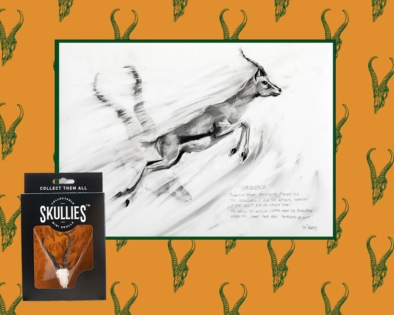 In Collaboration with Fine Art Artist Duncan Stewart, we bring you an Iconic South African Piece. Along with our 3D-Printed Palm sized collectable Resin skull of a Springbuck, you will also get an A3 sized Charcoal drawing (Fine Art Reprint) by Duncan Stewart.