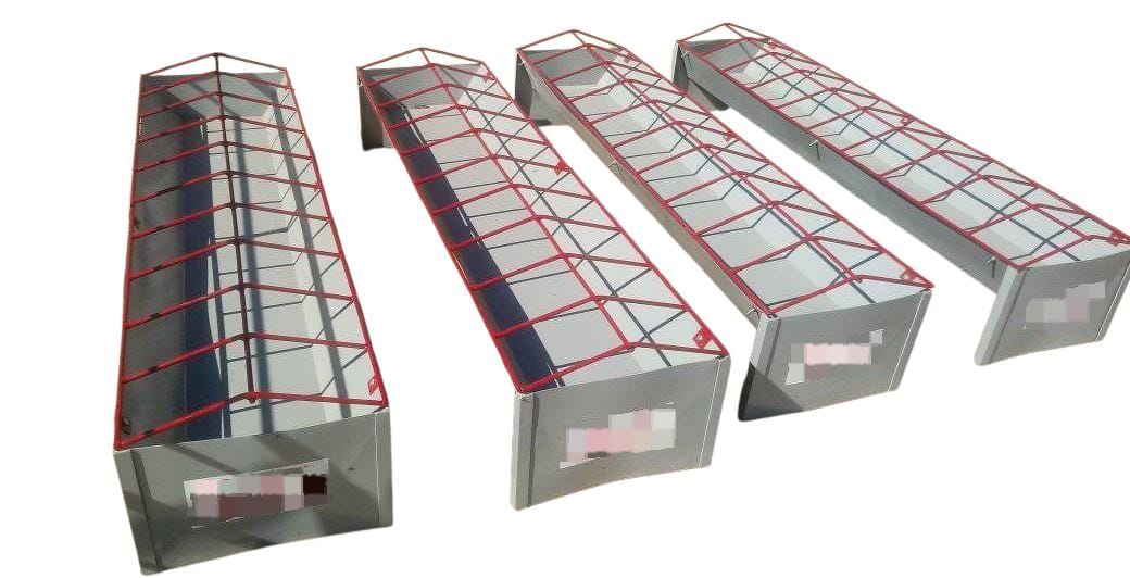 1.6mm steel plate and 10mm round bar partitions. Can feed 20 animals at once. Feeder is 2m long.